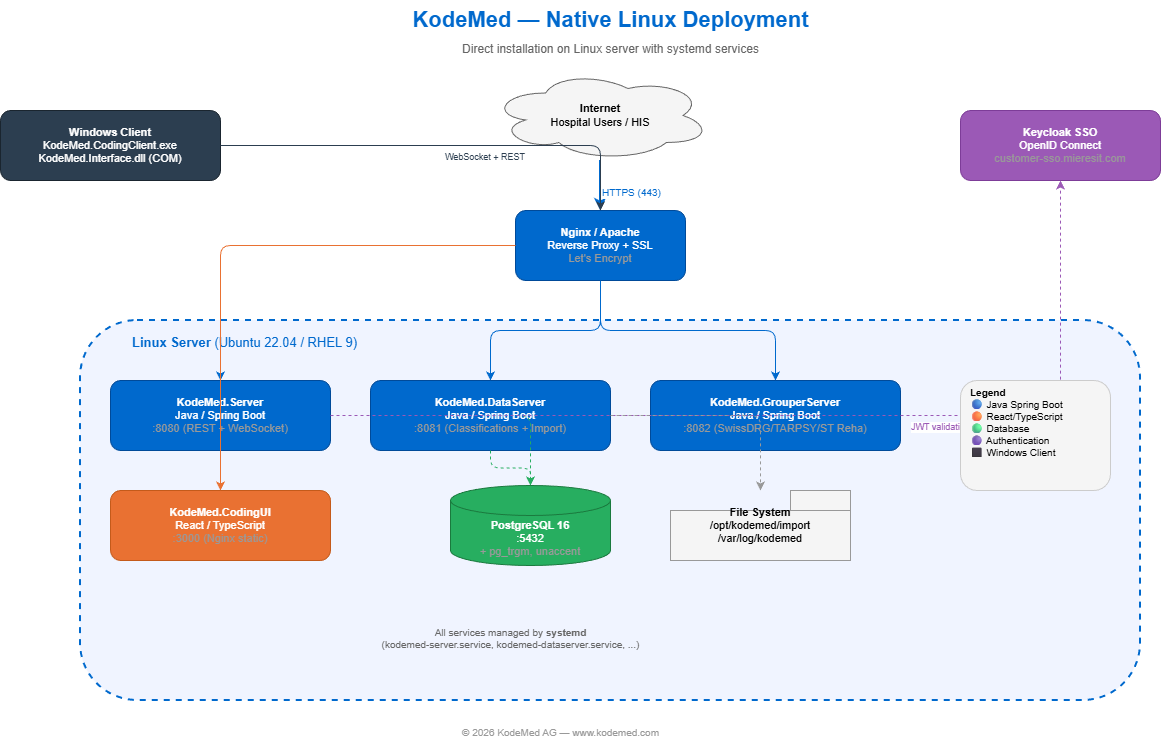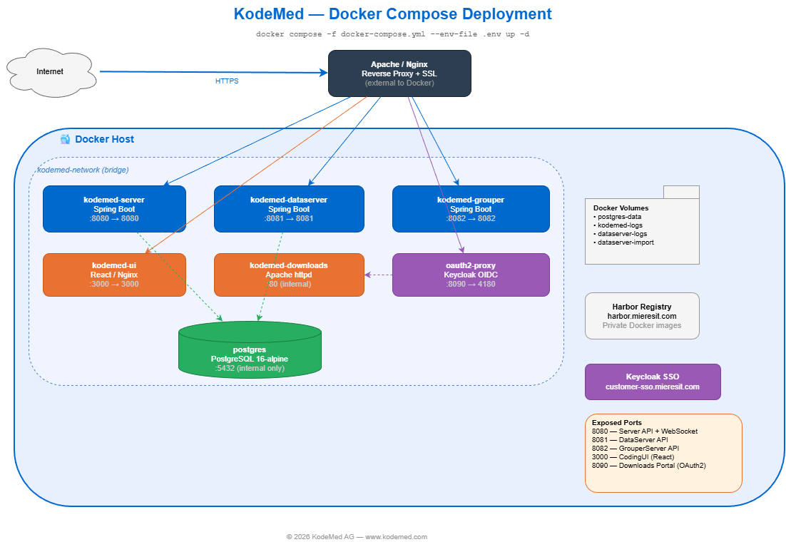 docker-compose.yml— orchestrates all KodeMed services (Server, DataServer, Grouper, CodingUI, PostgreSQL).env— passwords, URLs, and settings (keep this file secure)runtime-config.js— browser configuration for the CodingUI